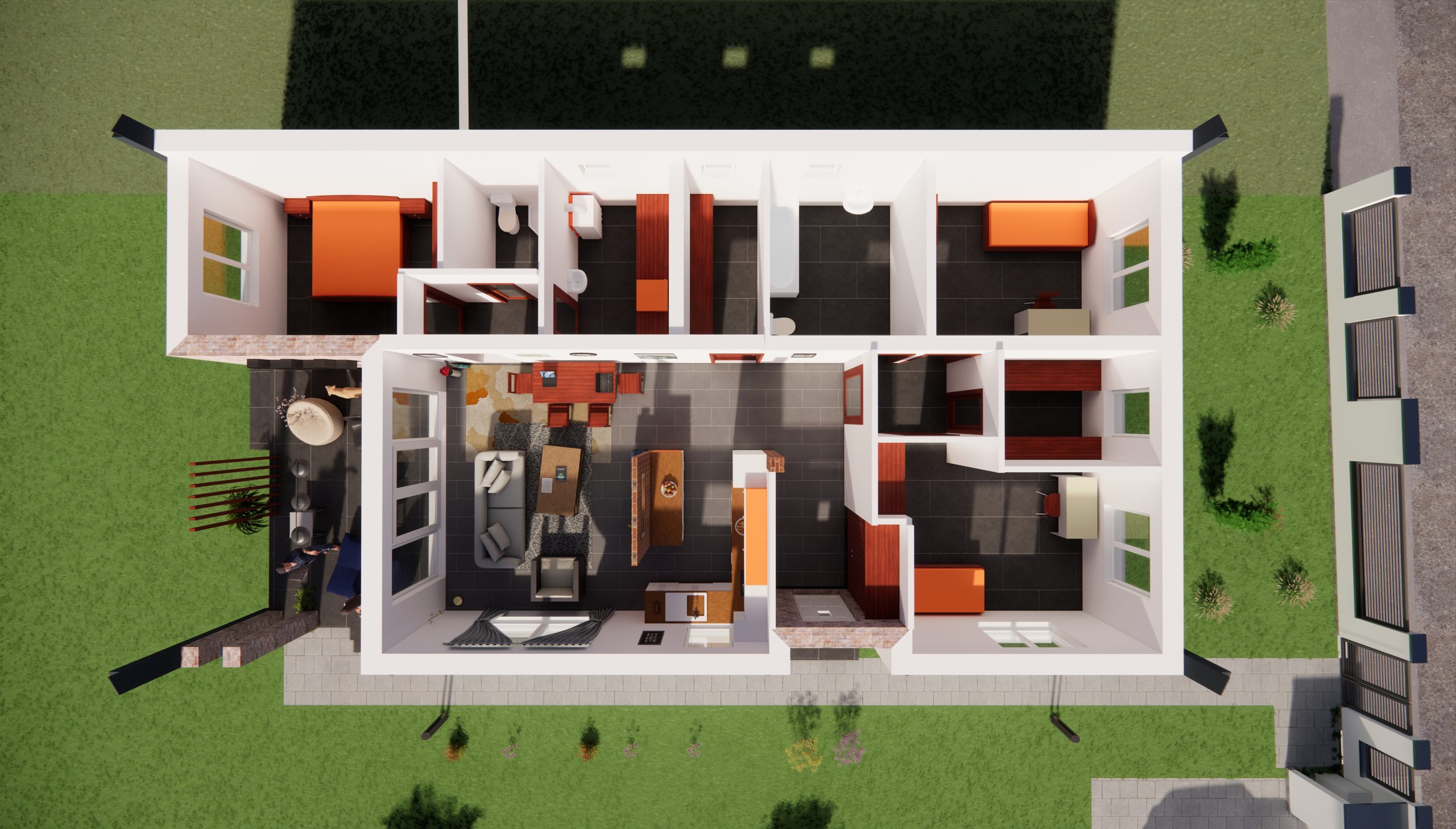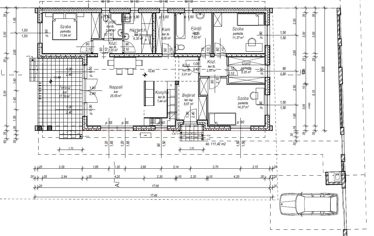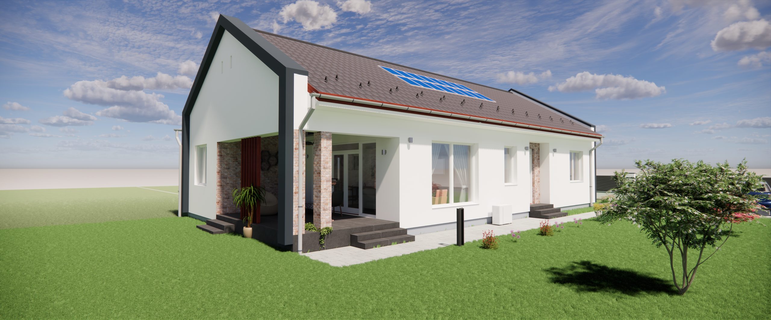 Ez a modern, egyszintes családi ház 110,82 m² nettó hasznos alapterületével, nappali + 3 szobájával ideális választás családok számára. A praktikus elrendezés egy tágas nappalit és három kényelmes hálószobát kínál, két fürdőszobával kiegészítve. A 17,59 m²-es fedett terasz kellemes kültéri kikapcsolódást biztosít. Az otthon alacsony üzemeltetési költségéről hőszivattyús fűtés, napelemes rendszer energiatárolóval, valamint Loxone intelligens otthonautomatizálás gondoskodik.