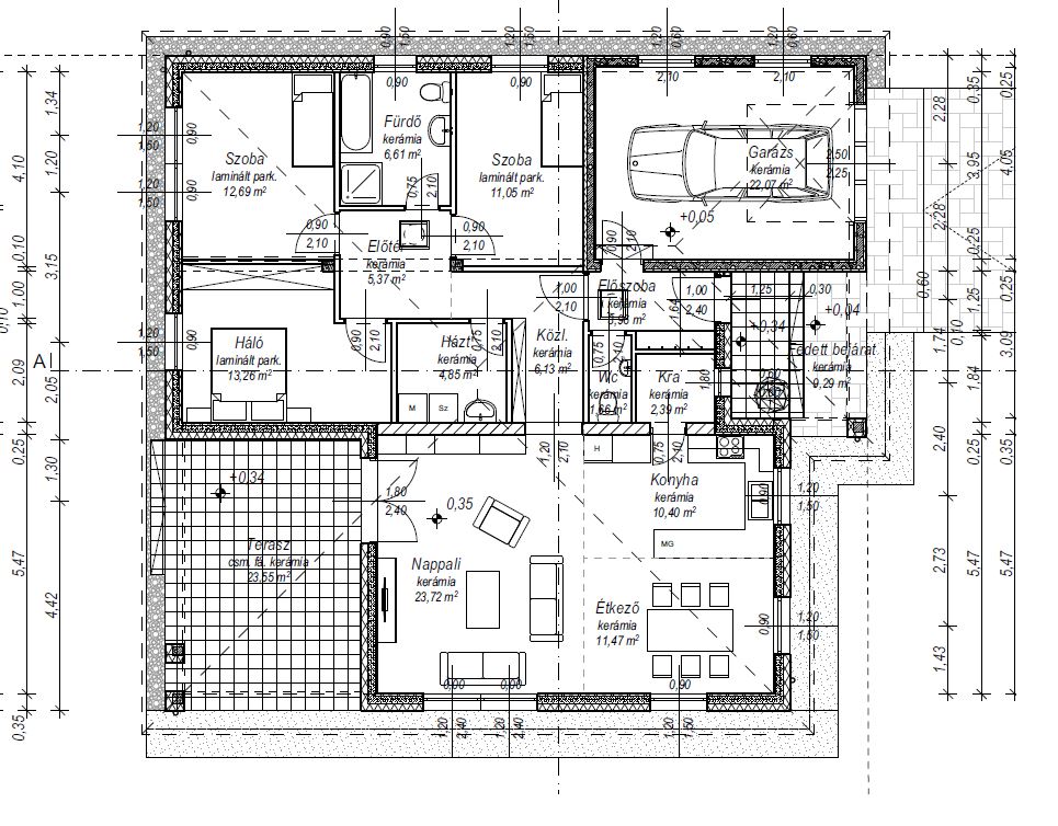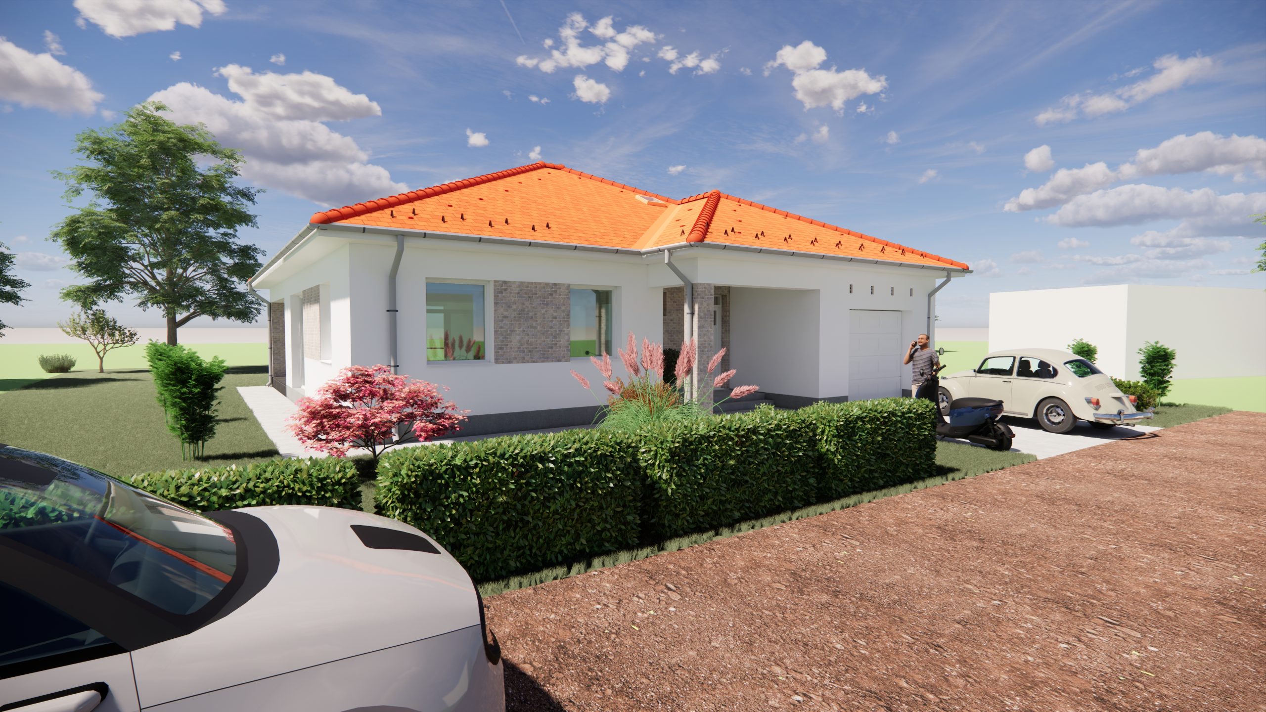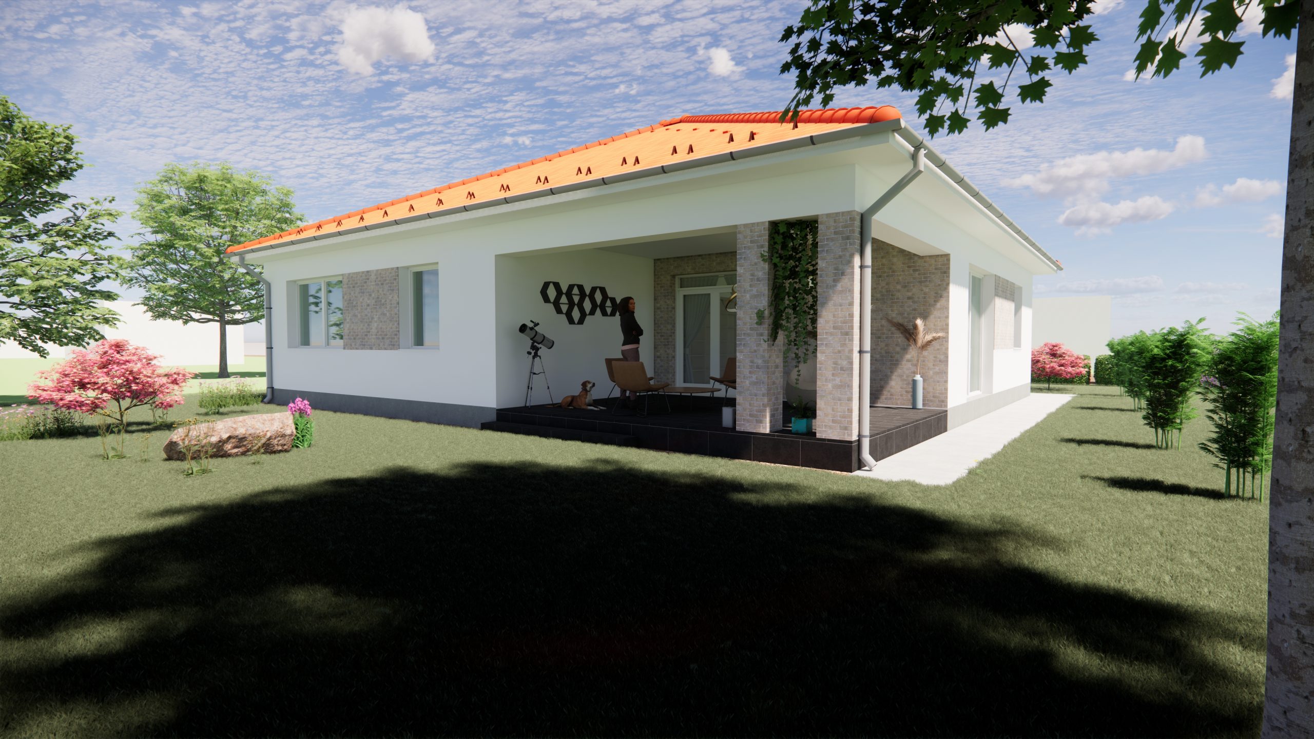 Ez a 113,56 m² nettó hasznos alapterületű, egyszintes családi ház modern kialakításával (nappali + 3 szobájával) és praktikus belső elrendezésével kínál kényelmes életteret. A tágas nappalihoz három külön nyíló szoba társul, míg a fürdőszobában elhelyezett WC mellett egy különálló mellékhelyiség is biztosítja a kényelmet. A 23,55 m²-es fedett terasz kiváló helyszín a szabadtéri pihenéshez, a 22,07 m²-es garázs pedig védett parkolást tesz lehetővé. Az otthon alacsony üzemeltetési költségéről hőszivattyús fűtés, napelemes rendszer energiatárolóval, valamint a Loxone intelligens otthonrendszer támogatja.